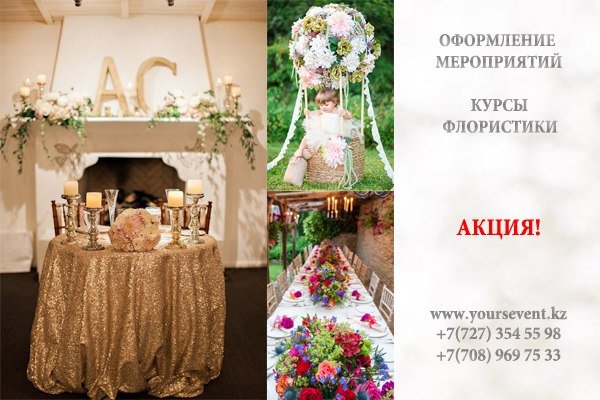 Оформление мероприятий. Курсы по флористики Вы давно любите цветы и хотите создавать ароматные шедевры? Тогда спешите! Наше агентство объявляет набор на курсы «Флористики». Привести с собой друга и получите скидку на курс 40%!