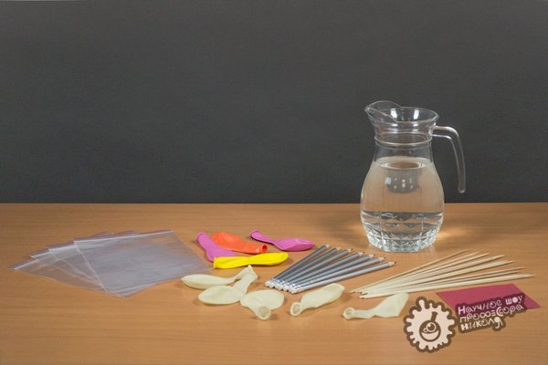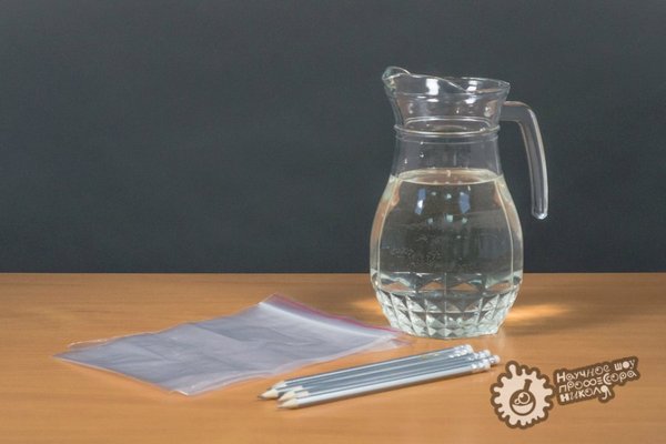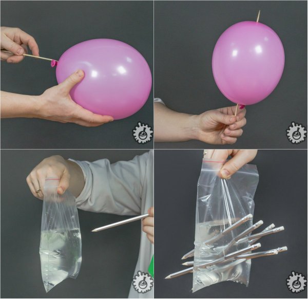 лочка окажется внутри шарика, теперь самое время проткнуть поверхность шарика палочкой с другой стороны. «Шашлык из шарика» готов! 3. Теперь пришло время наполнить пакетик водой и воткнуть в него карандаш. Поверхность пакета плотно обхватит карандаш, и вода не будет выливаться! 4. В пакет можно воткнуть множество карандашей, получив довольно интересную конструкцию. Интересно, что произойдёт, если вынуть карандаш?