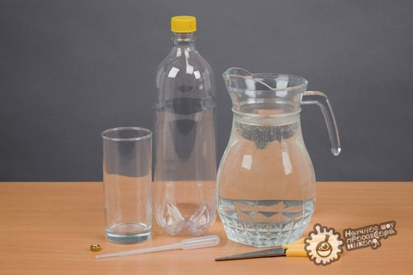 Научное шоу профессора Николя Москва (24.05.2017): Фото инструкция, как можно приготовить картезианский водолаз Нам потребуется: — вода; — бутылка с крышкой; — пипетка; — гайка; — ножницы; — стакан. Ход эксперимента: 1. Для начала отрежем при помощи ножниц часть пипетки и приделаем к ней гайку. 2. Добавим внутрь пипетки небольшое количество воды, чтобы она не тонула, но при этом несильно возвышалась над поверхностью. 3. Опустим пипетку внутрь бутылки, дольём воду доверху и закроем сверху крышкой. 4. Если надавить на стенки бутылки, пипетка опус… — Читать дальше