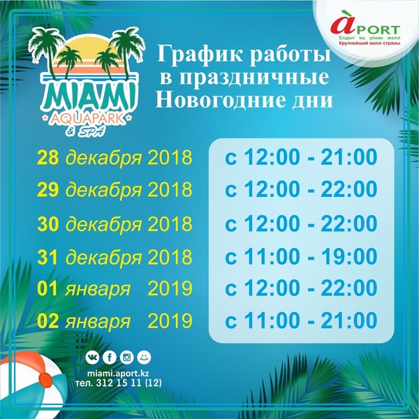 С наступающим Новым Годом, дорогие друзья! Представляем график работы аквапарка Майами в праздничные новогодние дни. Работаем для Вас каждый день! ️