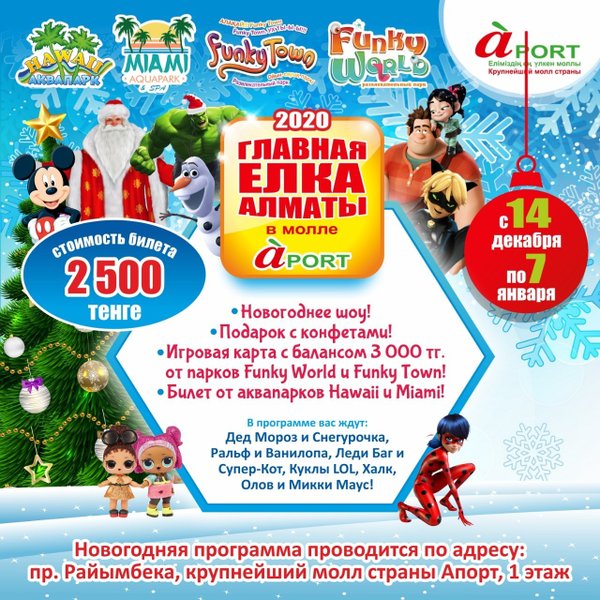 Самая главная Ёлка для детей! ⠀ С 14 декабря по 7 января на территории молла Апорт пройдут новогодние шоу! (ёлка пройдёт за пределами аквапарка внутри Апорта) ⠀ В стоимость билета входит: ⠀ Новогодняя программа с любимыми героями: Дед Мороз и Снегурочка, Ральф и Ванилопа, Леди Баг и Супер-Кот, Куклы LOL, Халк, Олов и Микки Маус! ⠀ Подарок с конфетами! ⠀ Билет в аквапарк Hawaii, Miami & Spa на 4 часа! ⠀ Игровая карта с балансом от парков Funky Word и Funky Town ! ⠀ Стоимость билета: 2 500 тенге.