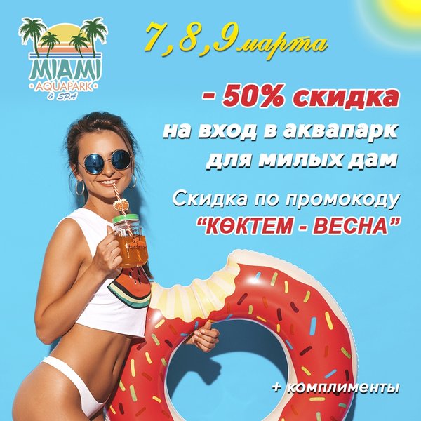Аквапарк Hawaii, Miami & Spa сделает Ваш праздник ещё ЯРЧЕ! ⠀ 7, 8, 9 марта СКИДКА до 50% на вход в аквапарк для всех девочек, девушек, женщин и бабушек по промокоду «КОКТЕМ-ВЕСНА» ⠀ В Miami Spa; Welcome Drink для прекрасных дам 21+ — бокал шампанского! Приятный подарок — услуга: маска для лица! (21+) ⠀ И конечно же, конкурсы, подарки, танцы, аквааэробика и море хорошего настроения! ⠀ Отмечайте самый прекрасный праздник вместе с нами!