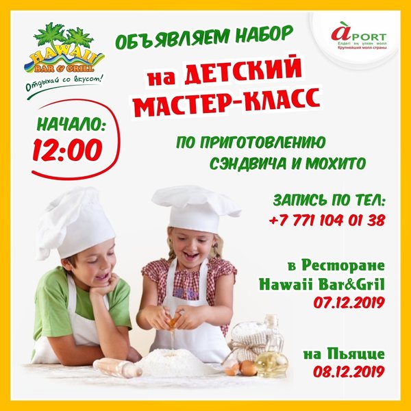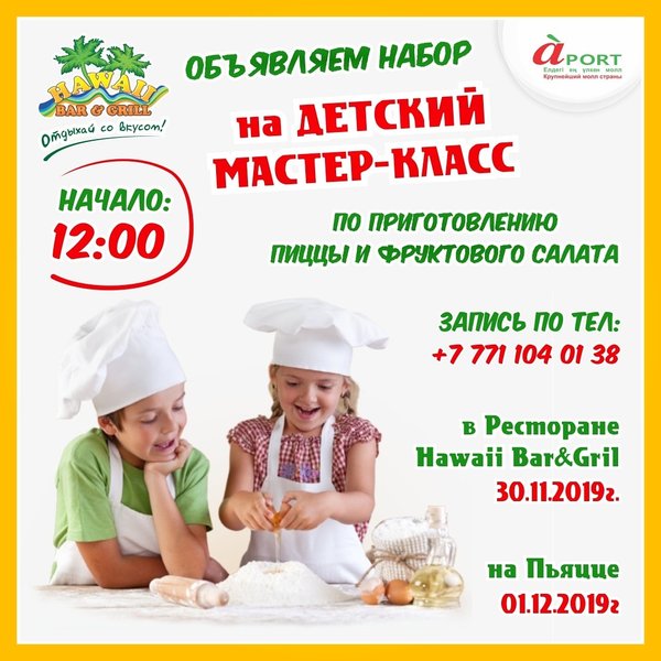 Приглашаем всех на мастер-класс по приготовлению пиццы и фруктового салата! ⠀ Мастер-класс для детей пройдёт: 30 ноября 2019 г в ресторане Hawaii Bar & Grill в 12:00 1 декабря 2019 г на 1 этаже молл Апорт на Пьяцце. Стоимость: 2000 тенге ⠀ Для бронирования мест звоните: