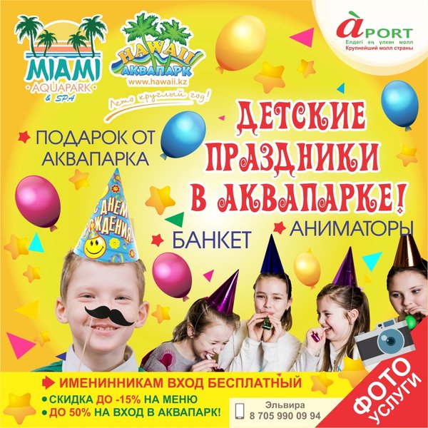 веряющего личность. ⠀ Также Ваш праздник могут раскрасить банкет и веселые аниматоры! *При заказе Дня Рождения в аквапарке получи скидку на меню -15%! *Услуги аниматора: 1. Сопровождение детей на 1 час до 5 человек — 5000 тг 2. Сопровождение детей на 1 час до 10 человек — 7000 тг 3. анимация игры 30 мин до 10 детей — 4000 тг 4. Квест до 5 детей 30 мин — 5000 тг 5. Квест до 10 детей 30 мин — 7000 тг 6. Эстафета 30 мин — 4000 тг 7. Поздравление на сцене с Днем Рождения — 3000 тг. Подробнее по организации праздников можно узнать по тел.:, Эльвира. ⠀ Мы работаем для Вас круглый год (и зимой и летом)! ⠀