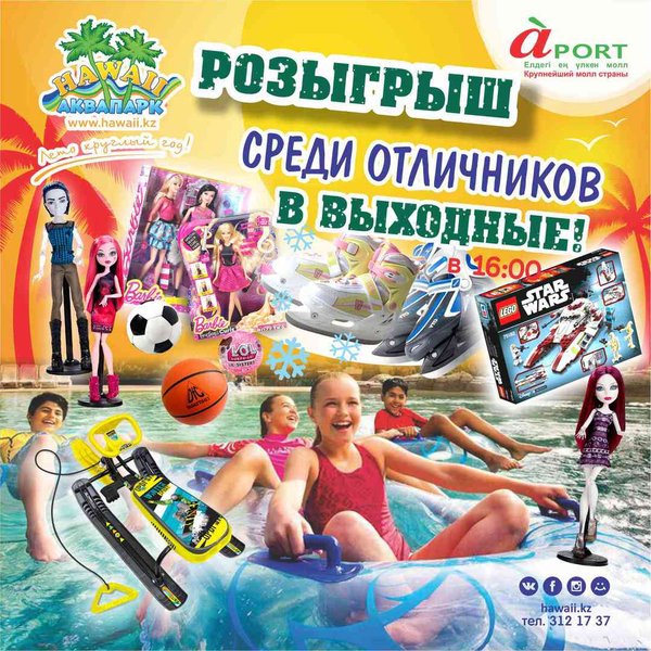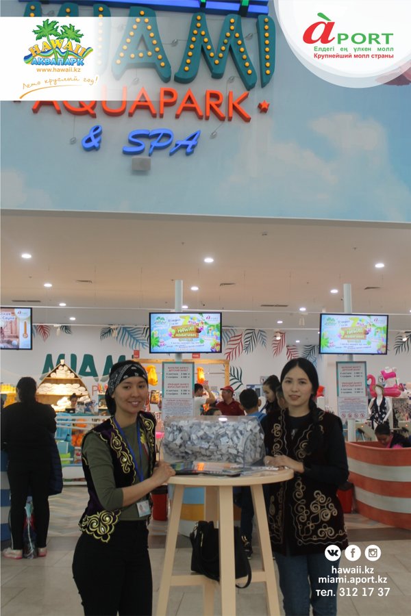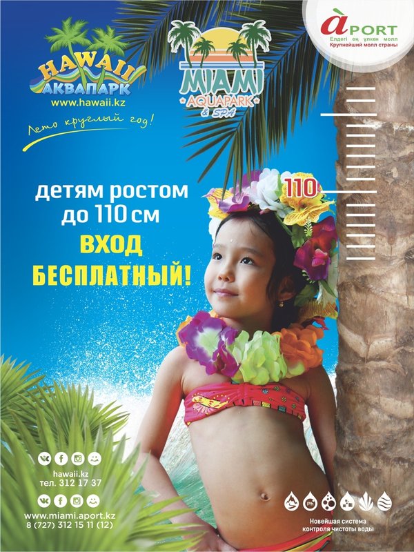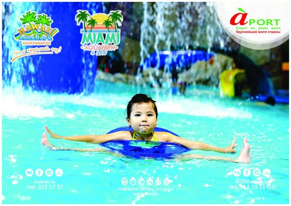 Приходи в Аквапарк Hawaii, Miami & Spa в пятницу, субботу или воскресенье (23, 24 или 25 октября) покупай билет на полный день и получай посещение SPA-центра в подарок! Детский билет: 4300 тенге вместо 6480тг Взрослый билет 4500 тенге вместо 8380тг Аквапарк — 35000кв.м лета и веселья! 12 видов горок 2 волновых бассейна Детская интерактивная зона ️ ️SPA-центр — райское место с 7 видами бань и саун и бассейнами с джакузи. Работаем ежедневно с 11:00 до 22:00 Наш адрес: г.Алматы, пр. Райымбека, молл Апорт