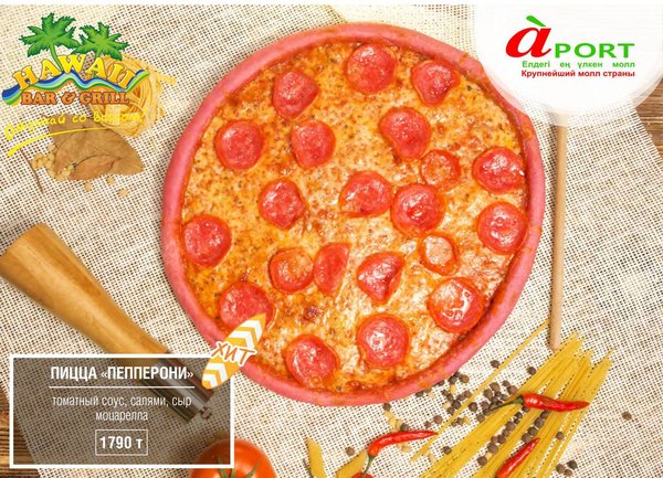 Сочная аппетитная пицца в ресторане Hawaii Bar&Grill Действует акция! При покупrе 1 пиццы — вторая в подарок! Акция действует в ресторане Hawaii Bar and Grill в молле Апорт, 1 этаж, рядом с аквапарком Гавайи. Тел.: 312 17 51/