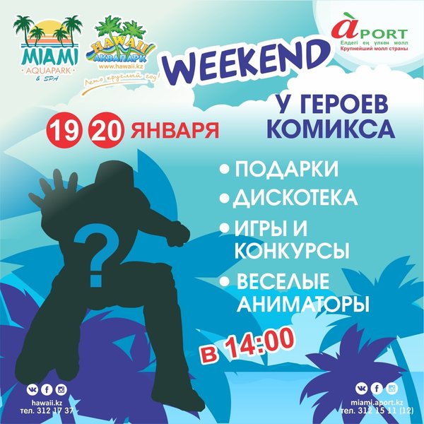 19 и 20 января «Weekend у героев комикса» в аквапарке Майами и Гавайи!⠀ Для Вас мы подготовили : * развлекательную программу с аниматорами * игры с героями комиксов * конкурсы, призы и подарки * акваэаробика * а также дискотека * с 16:00—17:00 – розыгрыш призов среди Отличников школ! ⠀ Начало в 14:00 Ждем Вас! ⠀ И напоминаем про акцию! Не упустите уникальную возможность посетить аквапарк + СПА центр на полный день всего за 3500 тг! Акция действует в любой день на взрослых и детей! Акция не действует с другими акциями аквапарка. Отдохни… — Читать дальше