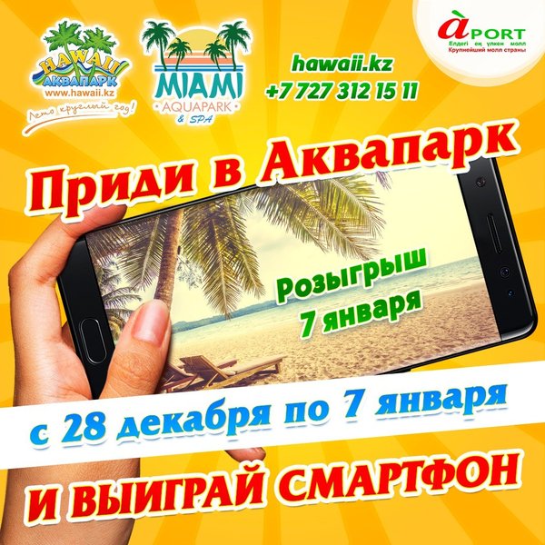 Друзья, 7 января состоится розыгрыш новенького смартфона! ⠀ Для того, чтобы стать участником акции Вам нужно: 1. Купить любой билет на кассе аквапарка или на сайте hawaii.kz с 28 декабря 2019 г по 07 января 2020г 2. Получить на кассе купон участника 3. Сохранить купон и чек до 7 января 2020г 4. Придти в аквапарк 7 января и положить «Часть 1» в лототрон, «Часть 2» оставить у себя ⠀ для участников акции в день розыгрыша стоимость посещения аквапарка будет следующая: ⠀ Взрослый 1990 тенге. Всем детям 1500 тенге.