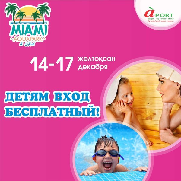 Только с 14 по 17 декабря ДЕТЯМ ВХОД БЕСПЛАТНЫЙ в аквапарк Hawaii & Miami и в Miami Spa! ⠀ Зима и холод — не повод сидеть дома или мёрзнуть на улице. Это повод приехать а аквапарк и отдохнуть по полной! ⠀ В аквапарке Hawaii, Miami & Spa два волновых бассейна, 12 видов горок, джакузи, 7 видов бань и саун и лето круглый год! ⠀ Ждём Вас по адресу: г.Алматы, Ташкентский тракт 17к, на территории молл Апорт