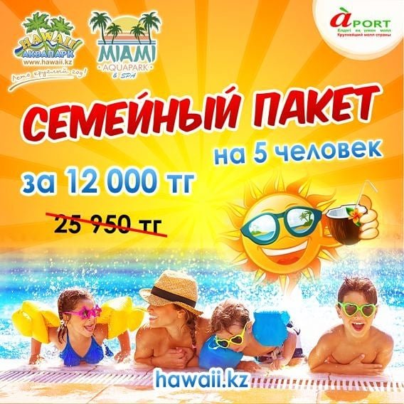 Хочешь пойти в аквапарк с семьёй или с друзьями?! ⠀ Покупай билеты по акции «Семейный пакет» — действует на компанию до 5 человек вне зависимости от возраста — общая цена пакета всего 12 000 тенге вместо 25 950 тенге! ⠀ За 1 человека по такому пакету получается всего 2400 тенге на полный день! ⠀ Акция и билеты по акции действуют до 30 июня 2020 г. ⠀ Приобрести можно на кассе и на сайте hawaii.kz. ⠀ *на 1 взрослого не более 3 детей согласно правилам аквапарка. Так же дети ниже 110см проходят бесплатно.