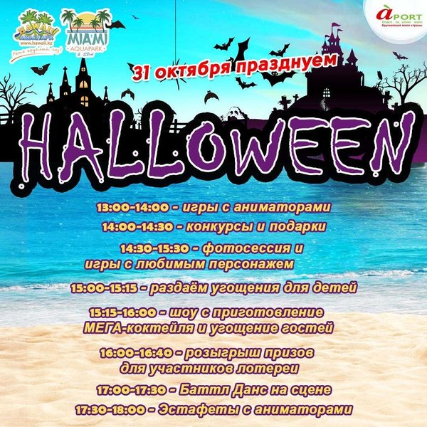 Ждём всех на Halloween! ⠀ Завтра в аквапарке Hawaii, Miami & Spa будет праздничная программа: танцы, конкурсы, угощения, МЕГА-коктейль и конечно, игры с любимым персонажем из фильма! ⠀ Начало в 13:00 ⠀ А для тех, кто пополнит электронный браслет на 5000 тенге и более в 16:00 будет розыгрыш ценных призов! ⠀ Приходи и зови друзей, чтобы не было так страшно!
