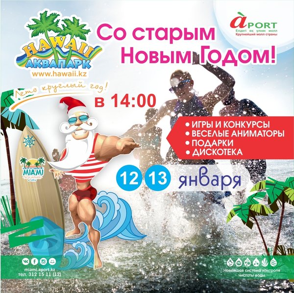 А мы продолжаем праздновать! 12 и 13 января Аквапарк Майами и Гавайи провожает старый Новый Год! Для Вас мы подготовили : * развлекательную программу с аниматорами * веселые игры с клоунами «Бим и Бом» * конкурсы, призы и подарки * а также дискотека ⠀ Начало в 14:00 ⠀