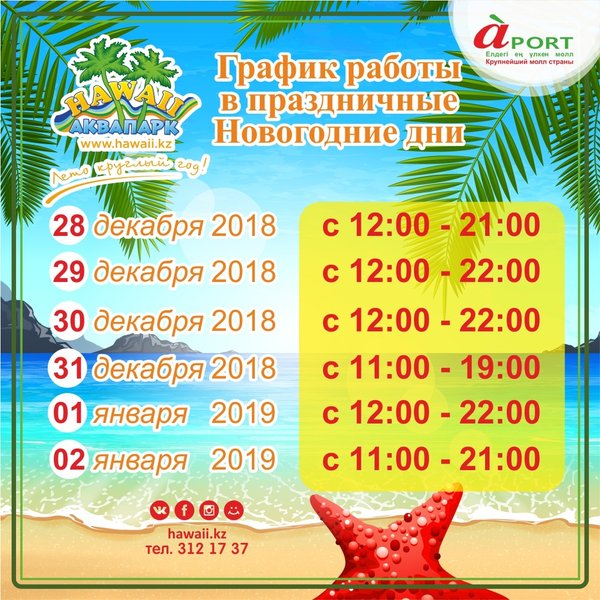 Уже запланировали поход в аквапарк Гавайи с детьми? Не забываем, что у нас действует акция: «Детям ростом до 110 см вход в аквапарк бесплатный») Ждем всех каждый день! График работы : ПН-ЧТ 12:00—21:00 ПТ 12:00—22:00 СБ 11:00—22:00 ВС 11:00—21:00 Подробнее по тел 312-15-11 (12) и 312- 17—37