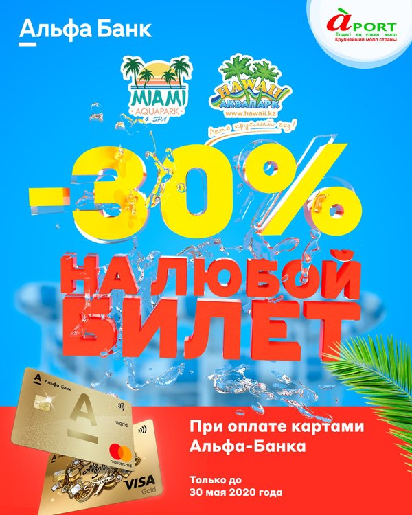 Добро пожаловать в лето вместе с Альфа-Банком! ️ ⠀ Полежать на шезлонге под шум прибоя в самый разгар зимы? Легко! Если вы участвуете в акции «Лето круглый год с Альфа-Банком». ⠀ Только до 30 мая при покупке любого билета в аквапарки Гавайи и Майями вы получаете скидку 30% при оплате любой картой Альфа-Банка. ⠀ Но это еще не все! Оплачивая «Лучшей картой Альфа-Банка», вы получаете кэшбек до 1,5%. Если у вас все еще нет карты Альфа-Банка, то самое время ее заказать на сайте @alfabankkz. ⠀ Заберите карту в отделении или закажите бесплатную д… — Читать дальше