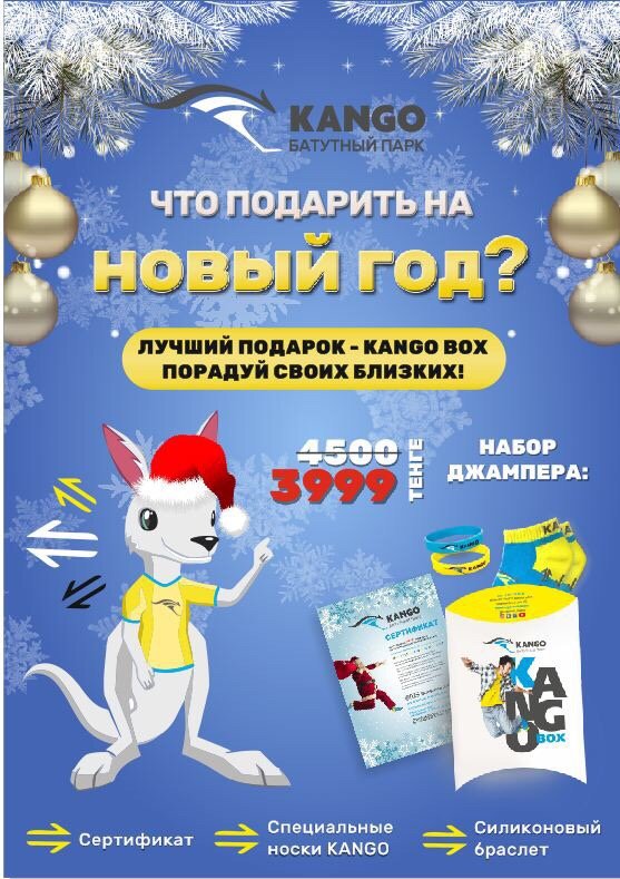 Ломаете голову, что подарить близким и друзьям на Новый Год? KANGO BOX — универсальный подарочный набор для взрослых и детей от 2-х лет, внутри вы найдёте: Сертификат на 1 час прыжков Носочки KANGO Силиконовый браслет _____________ ️Во время прыжков вырабатывается гормон счастья — эндорфин, поэтому мы можем с уверенностью заявить, что подарив близким KANGO BOX, вы подарите им счастье Справки по номеру: ТРЦ MEGA Alma-Ata, 2-й этаж