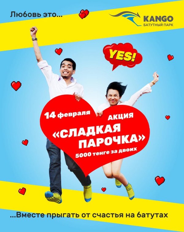 Любовь это…Вместе прыгать от счастья на батутах Согласен? Тогда бери своего любимого человека (парня, девушку, брата, сестру, папу, маму) и участвуй в акции Сладкая парочка! Только 14 февраля, покупая билет на двоих на 1 час ты платишь всего 5000 тенге Успей порадовать своих любимых Справки по телефону ТРЦ MEGA Alma-Ata, 2 этаж