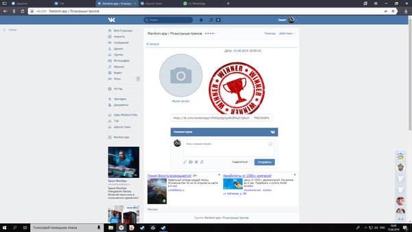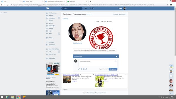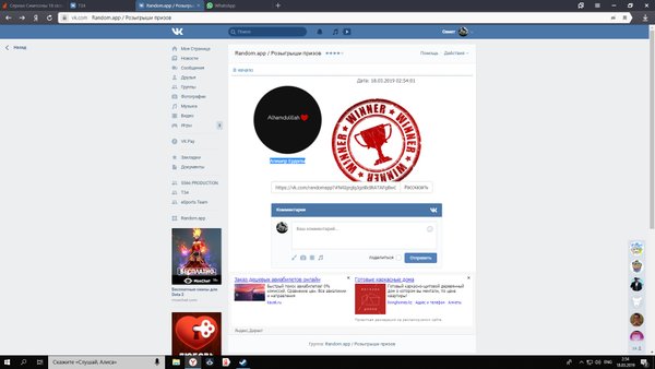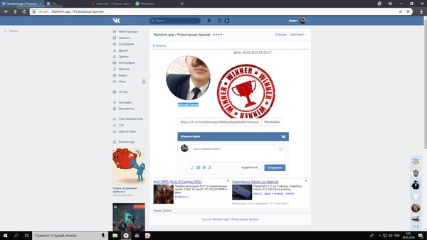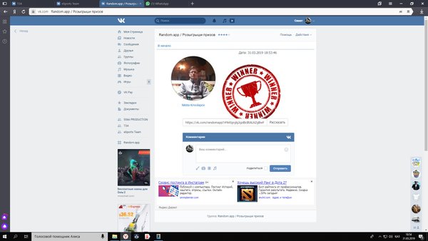Напоминаю, что для получения приза необходима явится на кассу в течении двух дней с удостоверением личности и страницей вконтакте