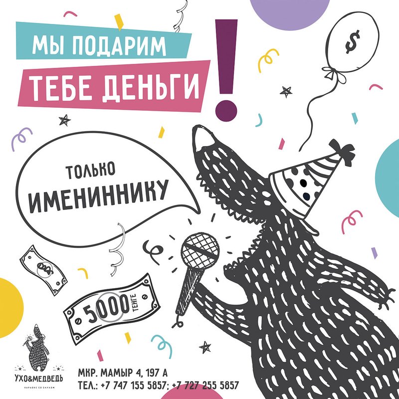 Всем именинникам в подарок от Миши сертификат и скидка! С Вс по Чт - 20% Пт, Сб и праздничные дни - 15% Сертификат на 5000 тг (можно использовать при следующем посещении нашего заведения).