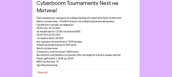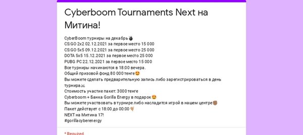 CyberBoom Championship CS:GO 2×2 Режим напарники 17 ноября в 18:00 Призовой фонд 30 000 Вы можете сделать предварительную запись либо зарегистрироваться в день турнира Стоимость участие пакет: 3000 тенге Cyberboom + Банка Gorilla Energy в подарок Вы можете участвовать в турнире либо насладится игрой в нашем центре Пакет действует с 18:00 до 00:00 Митина,17 Семейный центр NEXT!