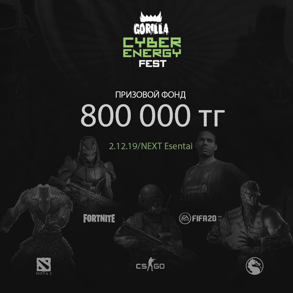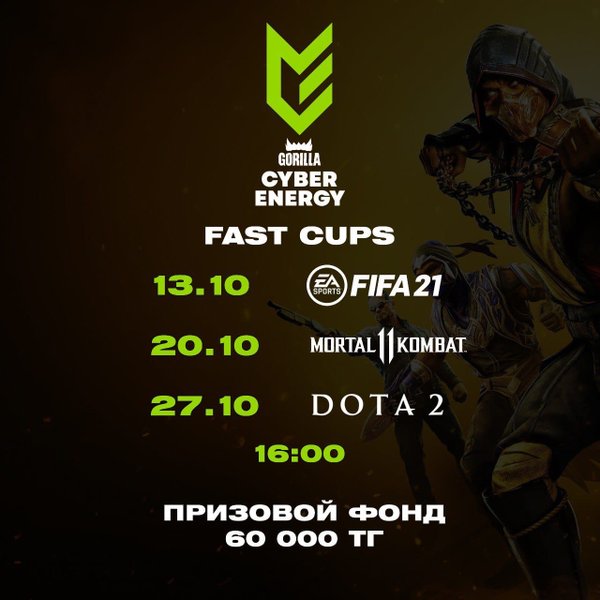 Gorilla Cyber Energy Fast Cups на октябрь месяц! Регистрация в день турнира, начало в 16:00! Общий призовой фонд 60 000 тенге! Участие бесплатное. Online Отбор для Дотеров 24 октября Lan Finals 27 октября. Для участников Dota 2 регистрация