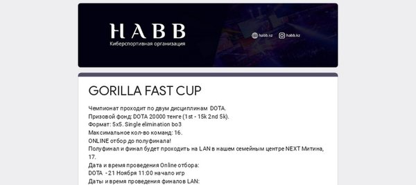 стие в турнирах — 1000 тенге с человека. Регистрация и более подробная информация на нашем дискорд канале HABB.kz ссылка!