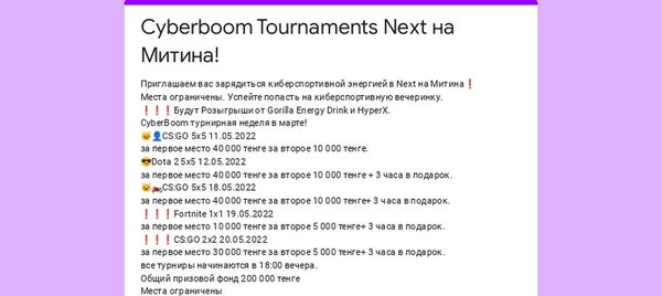 5 000 тенге+ 3 часа в подарок. CS:GO 2×2 20.05.2022 за первое место 30 000 тенге за второе 5 000 тенге+ 3 часа в подарок. все турниры начинаются в 18:00 вечера. Общий призовой фонд 200 000 тенге Места ограничены ссылка на регистрацию Стоимость участие пакет: 3000 тенге с человека. Вы можете участвовать в турнире либо насладится игрой в нашем центре Пакет действует с 18:00 до 22:00 NEXT на Митина 17