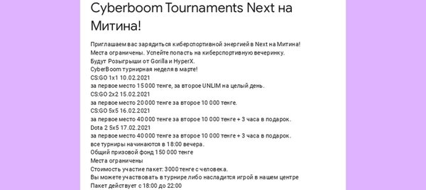 Приглашаем вас зарядиться киберспортивной энергией в Next на Митина! Места ограничены. Успейте попасть на киберспортивную вечеринку. Будут Розыгрыши от Gorilla и HyperX. CyberBoom турнирная неделя в марте! СS:GO 1×1 10.03.2022 за первое место 15 000 тенге, за второе 5000 тенге и UNLIM на целый день. CS:GO 2×2 15.03.2022 за первое место 20 000 тенге за второе 10 000 тенге. СS:GO 5×5 16.03.2022 за первое место 40 000 тенге за второе 10 000 тенге + 3 часа в подарок. Dota 2 5×5 17.03.2022 за первое место 40 000 тенге за второе 10 000 тенге + 3 часа… — Читать дальше