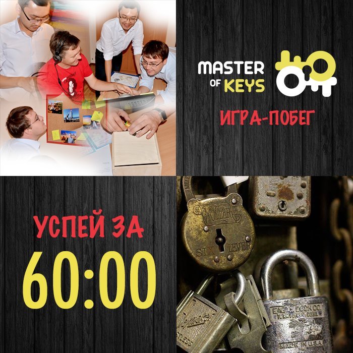 «Мастер ключей» — это уникальный проект-игра, полная головоломок, загадок и приключений. Правила просты: команда от 2 до 6 человек помещается в комнату «кабинет агента КГБ Петренко», где есть только 60 минут, для того чтобы решить все задачи и выбраться. Забронировать сессию можно прямо на сайте либо по телефону. Стоимость игры на человека составляет 5 000 до 3 500 тенге, в зависимости от количества игроков.