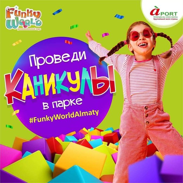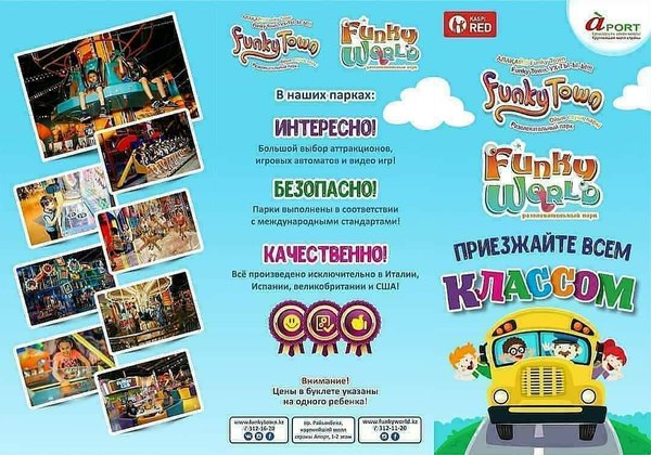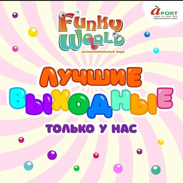 Ждём Вас в крупнейшем Парке развлечений Funky World! ᅠ 8 аттракционов 108 игровых аппаратов Множество видеоигр Огромнейший лабиринт Ясли для малышей Большая батутная зона Кафе @funky_lab_almaty ᅠ Огромная территория, наполненная всевозможными развлечениями для детей и взрослых! Скучно не будет НИКОМУ! ᅠ ️Приехать всем классом? Легко! Отметить день рождения? Легко! Конкурсы? Обязательно! Розыгрыши? Безусловно! ️А ещё АКЦИИ, ПОДАРКИ! ️Это все у нас! ᅠ Каждый день: 10:00—23:00 Первый этаж Mall Aport. ᅠ Ждём Вас! ᅠ