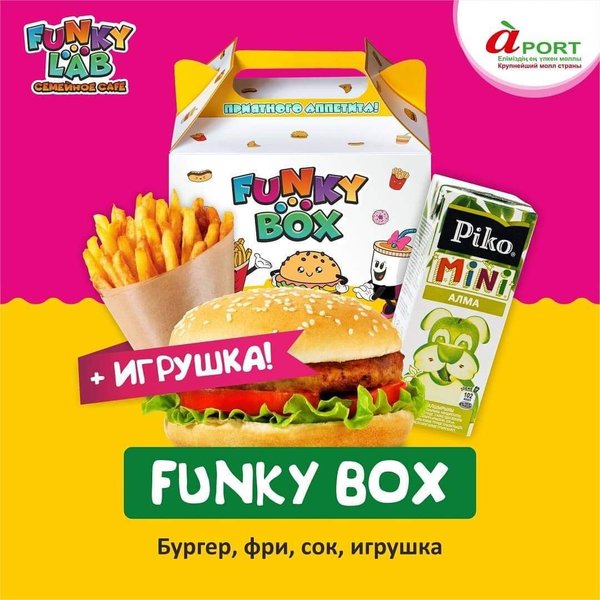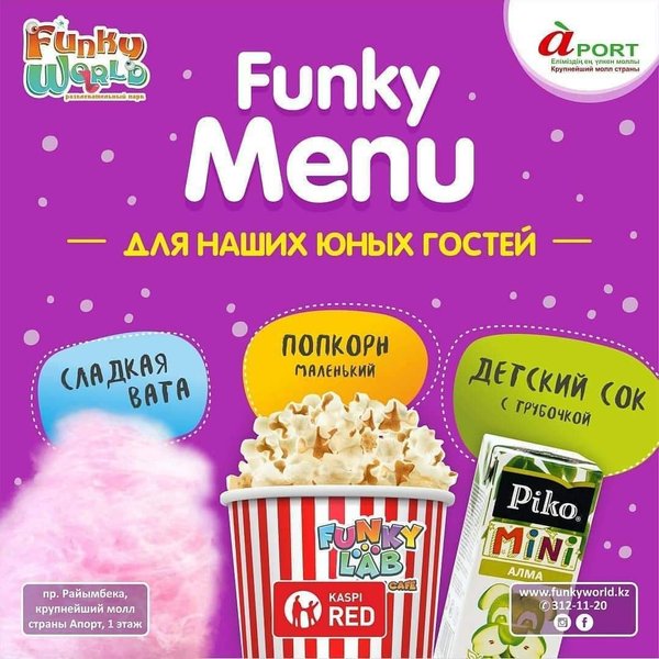 Детское меню — Funky box От Funky Lab Веселая обстановка, ощущение постоянного праздника ждут Вас каждый день! В парке проводится акция «Наурыз Фестиваль» ️ Ждем Вас с 10.00 до 22.00 ️ С любовью ваш Funky World!