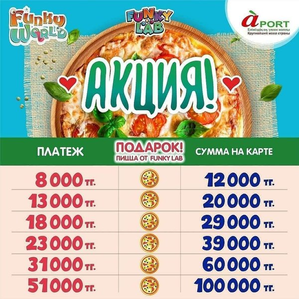 Добрый день, дорогие друзья! Как у вас сегодня настроение? ᅠ Приходи, пополняй игровую карту и получай дополнительно: Бонусы Пиццу от кафе Funky Lab! ᅠ И ещё, не забывайте, что при пополнении игровой карты от 8000 тенге, вы получаете купон на розыгрыш 2.000.000 тенге! ᅠ ️Ждём вас в гости! ️