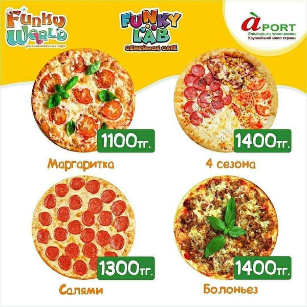 и) Куриные наггетсы (2 порции) ️Осьминожки (2 порции) Картофель Фри (4 порции) Компот (2 кувшина) ᅠ Пакет «Все включено» ️Стоимость 30000 тенге На выбор: 1 карта с балансом 40000 тенге 8 карт с балансом 5000 тенге ᅠ Экскурсия по Моллу на поезде Батут или Ясли (30 минут) ᅠ Меню от Funky Lab: Пицца Маргаритка (2 порции) Куриные наггетсы (2 порции) ️Осьминожки (2 порции) Картофель Фри (4 порции) Компот (2 кувшина) ᅠ Так же, дополнительно можно заказать: Шоу мыльных пузырей Бумажное Шоу Аниматоры ᅠ ᅠ