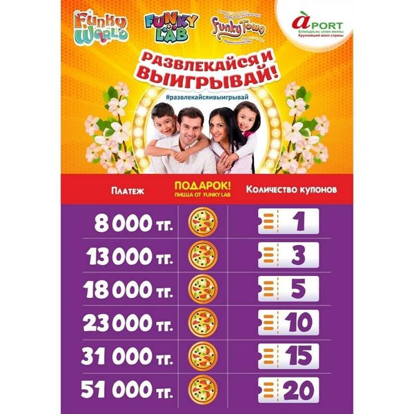 вместе с Funky World! ᅠ Чтобы участвовать в Розыгрыше, надо пополнить игровую карту на сумму от 8000 тенге и получить купоны! А вкусная пицца в подарок! ᅠ 8000 тенге + = 1 купон 13000 тенге + = 3 купона 18000 тенге + = 5 купонов 23000 тенге + = 10 купонов 31000 тенге + = 15 купонов 51000 тенге + = 20 купонов ᅠ Чем больше купонов, тем больше шансов на выигрыш призов! ᅠ