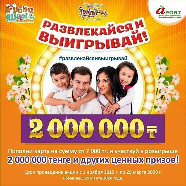 вместе с Funky World и Funky Town!!! ᅠ С 1 ноября по 29 марта! При пополнении игровой карты от 7000 тенге у каждого из вас есть реальный шанс выиграть 2.000.000 тенге и много других ценных призов! Чем больше купонов, тем выше шанс выиграть! И даже не один приз! ᅠ WOW! Кто готов выиграть 2? ᅠ 7000 тенге = 1 купон 12000 тенге = 3 купона 17000 тенге = 5 купонов 22000 тенге = 10 купонов 30000 тенге = 15 купонов ️50000 тенге = 20 купонов ᅠ Начали! Пишите в комментариях, на что потратите выигрыш?