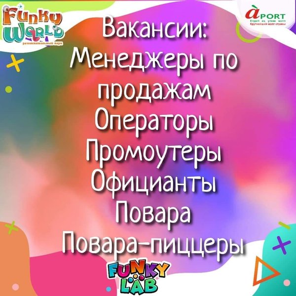 Доброго дня, друзья! Мы хотим сообщить вам о свободных вакансиях. Менеджеры по корпоративным продажам. Операторы на аттракционы. Аниматоры. Промоутеры и продавцы шаров. Жибек Бауржан ᅠ Нам нужны ответственные, целеустремлённые, амбициозные и пунктуальные работники! ᅠ Срочно требуются сотрудники семейному кафе Funky Lab. Который находится в Молл Апорте. Повара, пиццеры, официанты и бармены кассиры Требования возраст от 18 до 45 лет Условия график 2/2 Своевременная оплата +% Обед + развозка Имеется обучение Дружный коллектив. Жанара ᅠ