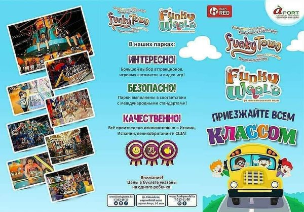 Құрметті достар! Біздің Funky World бағымызды таңдап, сенім артқаңыздарға алғысымыз шексіз! Кaspi Red көмегімен, демылыстар одан да жақсы болады. Сіздерді күн сайын 10:00 ден 23:00 дейін асыға күтеміз! ️Біз сіздерді жақсы көреміз! ️ ᅠ Дорогие друзья! Спасибо Вам за доверие, за то, что выбираете именно наш парк Funky World! Kaspi Red сделает посещение нашего парка ещё приятней! Ждём Вас каждый день с 10:00 до 23:00! ️Мы Вас Любим! ️ ᅠ