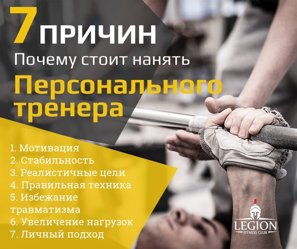 7 ПРИЧИН ПОЧЕМУ СТОИТ НАНЯТЬ ПЕРСОНАЛЬНОГО ТРЕНЕРА --------------------------------------- 1. Мотивация 2. Стабильность 3. Реалистичные идеи 4. Правильная техника 5. Избежание травматизма 6. Увеличение нагрузок 7. Личный подход