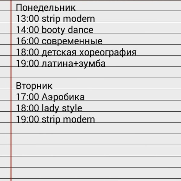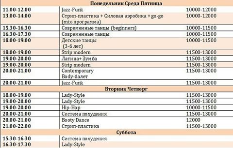 18.00-Lady style 19.00-lady style, современные танцы 20.00-booty dance, система похудения 21.00-strip modern