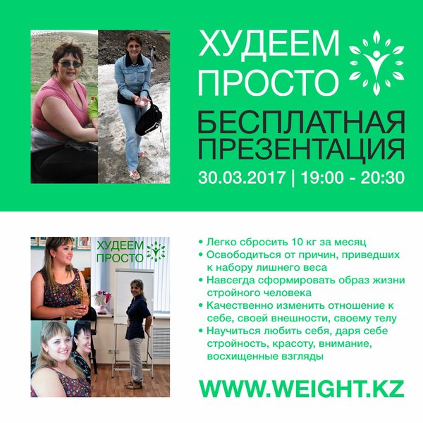 изма. ▪ Формирование и развитие в вас стройной личности. ▪ Замена выгоды от лишнего веса и переедания на более эффективные модели поведения. ▪ Групповая поддержка. Вы сможете делиться своими успехами, видеть результаты других участников, советоваться с ними и мотивировать себя на достижение своей цели. ▪ Гарантированный сброс веса минимум на 10—20% от стартового, в случае подтверждения соблюдения всех рекомендаций. *** ОРГАНИЗАЦИОННАЯ ИНФОРМАЦИЯ Презентация состоится: 03 мая 2017 года, с 19:00 до 20:00. Участие в презентации дает возможность получить скидку 20% на прохождение всей программы Худеем Просто! Наш адрес: пр. Сейфуллина 531, уг. ул. Казыбек Би (быв. ул. Советская), БЦ «Сарыарка», 2-й этаж, офис 203 — «Первый НЛП Центр». *** ПЕРВЫЙ НЛП ЦЕНТР В КАЗАХСТАНЕ Тел.: Моб.: WP.: Email: info@weight.kz Сайт: