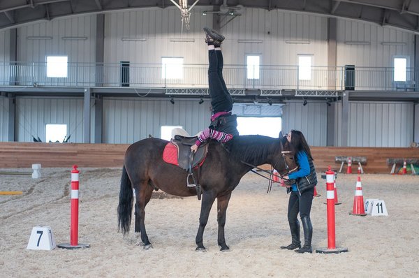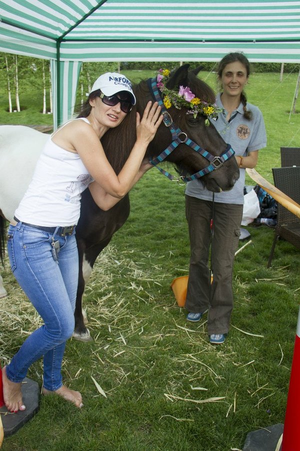 бя в руки» и с удовольствием сотрудничала с нами. Благодаря этому небольшому выступлению многие люди смогли воочию увидеть и оценить результаты мягкой работы с лошадью. Следующей частью выступления была презентация урока со всадником. На самом деле, упражнение лишь кажется простым: мы сажаем на лошадь без седла человека и просим его закрыть глаза. Это – основная медитативная техника, которую мы используем в ежедневной работе с нашими клиентами на занятиях. Однако, неопытному всаднику трудно, поначалу, довериться своим ощущениям. В процессе прохождения через несколько уровней трансформации, человек начинает расслабляться. Равномерный, покачивающий шаг лошади позволяет снять блоки и зажимы в теле всадника, улучшает кровообращение и работу суставов, связок, сухожилий. Закрытые глаза помогут покинуть привычную зону комфорта и довериться происходящему потоку событий. Также, начинают подключаться к работе и другие, мало задействованные в обычной жизни, органы чувств. Доверие к доброму и сильному существу помогает снимать стрессы, выводит из депрессий, успокаивает и нормализует умственную деятельность. Суть упражнения – найти равновесие в потоке, в движении не имея возможночти видеть, куда движешься и когда будет поворот Но совместив свой центр тяжести с центром тяжести лошади любые неожиданности уже не будут страшны. Без усилий и напряжения вы остаётесь сидеть верхом на лошади. Лошади – хорошие провоники в состояние «здесь и сейчас», они учат нас быть в настоящем моменте, глубокой гармонии с собой и миром.