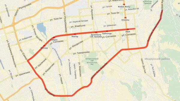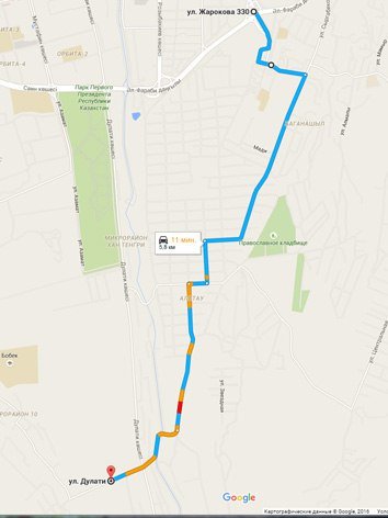 Примерная схема проезда от перекрестка улиц Жарокова и аль-Фараби до ул. Навои