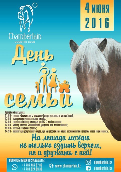 Приглашаем всех к нам в клуб на праздник! Программа праздника: 11.00 тренинг Знакомство с лошадью (могут участвовать дети от 5 лет); 12.00 выступление учеников нашего клуба; 13.00 творческий мастер класс для детей 3—7 лет (по записи); 13.00 мастер-класс по мыловарению для детей от 6 лет (по записи); 13.00 веселые семейные старты; 14.30 презентация услуг нашего клуба, где мы расскажем о наших возможностях и ответим на все ваши вопросы.