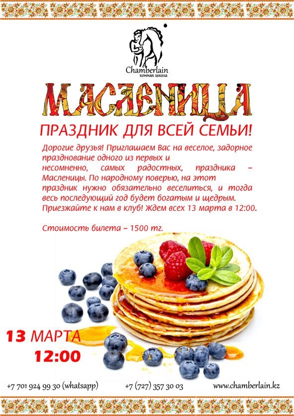 Кому билетики? Спешите приобрести билеты на наше Новогоднее представление с лошадьми! У Вас есть возможность приобрести билеты: 1) Заказав бесплатную доставку билетов на дом Телефон для заказов: +7 701 924 99 30 2) В нашем Country club «Chamberlain» мкр. Жайлау, 169 Тел: +7 701 924 99 30 3) У наших партнеров в детском клубе «La Fame» Басенова 27А Тел: 275-22-99 4) Онлайн на сайте Тикетон: Стоимость: Входной билет — 10 000тг. Входной билет с подарком — 15 000тг. Ждем Вас с нетерпением 25 декабря в 17:00!