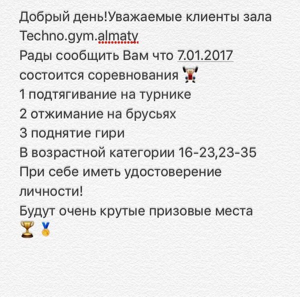 в Из моих учеников пятеро уже стали Кандидатами Мастера Спорта, чему я очень горд и рад! Помимо работы со взрослыми я занимаюсь с детьми разных возрастов, и вижу в каждом из них потенциал и стремление достигать наивысших высот! Я буду очень счастлив видеть Вас в нашем фитнес- центре ТехноGYM ️ Мы находимся по адресу Райымбека 221Ж (Остановка Баня) ⌚️Пн-Пт 7:00—23:00; Суб 09:00—22:00 ️ Расул Будем ждать Вас! #