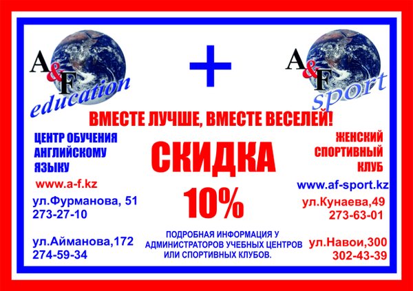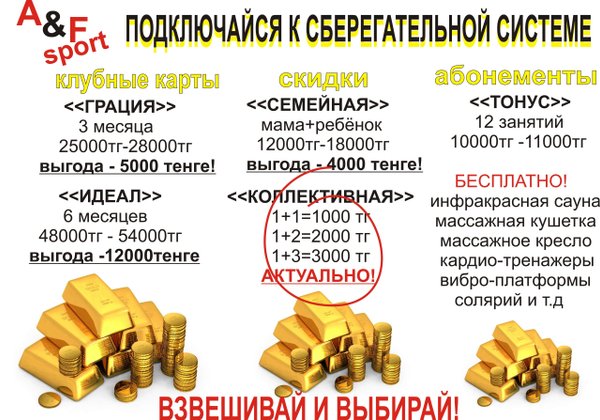 Только вместе можно добиться хороших результатов! Поэтому наш девиз: Вместе лучше, вместе веселей! Вступай в клуб A&Fsport и твоя жизнь наполнится здоровьем, молодостью, красотой!!!!