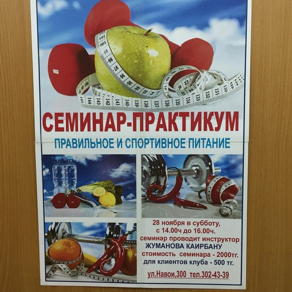 В субботу 28 ноября в 14.00 состоится семинар-практикум: правильное и спортивное питание. Презентует Инструктор Жуманова Каирбану.