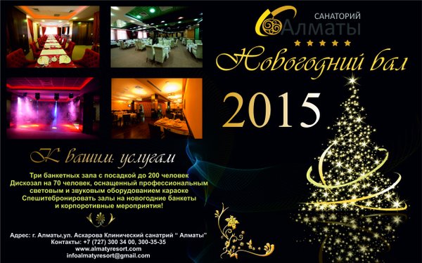 Сделайте подарок своим родным на Новый год! Новогодний бал в санатории Almaty Resort с развлекательной шоу-программой и оздоровительный отдых на широкий выбор! Кинотеатр, бильярд, сауна, бассейн, тренажерный зал — и все бесплатно! Спешите! Время еще есть! Действует новогодняя скидка -20% на проживание! Подробнее: