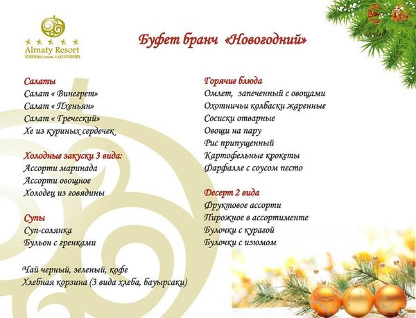 Где Вы планируете провести Новый год? Собирайтесь с друзьями и семьей на незабываемую шоу-программу в санатории «Almaty Resort»! Изысканный праздничный гала ужин, эксклюзивные блюда от шеф-повара Almaty Resort, чарующие огненное шоу на леденящем воздухе в предгорьях Заилийского Алатау, потрясающие фейерверки, сюрпризы, конкурсы, и многое, многое другое Отдых в комфортабельных номерах пятизвездочного курорта для чудесной встречи Нового года. Подробнее: