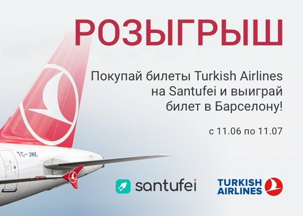 ю Turkish Airlines на Santufei и автоматически становишься участником розыгрыша. Главные условия: Билет должен быть приобретен в период с 11 июня по 11 июля 2018 года на сайте Santufei или в нашем мобильном приложении. А 12 июля мы узнаем, кто из счастливчиков получит сертификат на перелет в Барселону или два апгрейда в Бизнес-класс на рейс Алматы-Стамбул. Но и это еще не все: еженедельно мы будем разыгрывать два брендированных подарка от Turkish Airlines. Участвуешь? Подробности по ссылке -