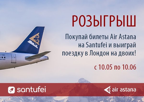 телей и напоминаем, что у вас еще есть время до 10 июня, чтобы поучаствовать в розыгрыше и побороться за главные призы: Сертификат на двоих на перелет в Лондон и обратно при покупке авиабилета на любой международный рейс Air Astana; Сертификат на двоих на перелет по Казахстану (кроме Алматы-Астана) при покупке авиабилета на любой внутренний рейс Air Astana; Два апгрейда в Бизнес-класс на рейс в Москву при покупке авиабилета по этому направлению.
